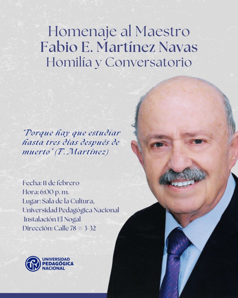 La Facultad de Artes invita a la comunidad universitaria y al público en general al Homenaje al Maestro Fabio Martínez Navas: Homilía y Conversatorio, un encuentro conmemorativo en memoria del profesor Fabio Martínez Navas, fallecido el 11 de febrero de 2025, quien dejó una huella profunda en la Licenciatura en Música y en la educación musical del país. Durante 53 años estuvo vinculado a la Universidad Pedagógica Nacional, entregándolo todo al campo de la pedagogía y dedicando su vida a resaltar y promover la música colombiana a través de la enseñanza, así como al desarrollo de procesos de innovación educativa mediados por las nuevas tecnologías de la información.